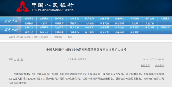 12月5日,中国人民银行官网显示,中国人民银行与澳门金融管理局签署常备互换协议并扩大规模。