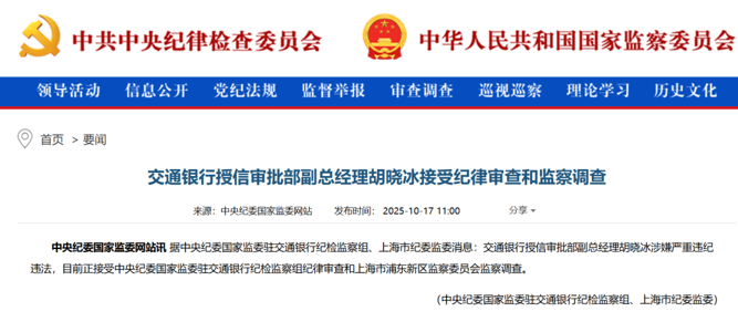 10月17日,中央纪委国家监委官网通报:交通银行授信审批部副总经理胡晓冰涉嫌严重违纪违法,目前正接受中央纪委国家监委驻交通银行纪检监察组纪律审查和上海市浦东新区监察委员会监察调查。