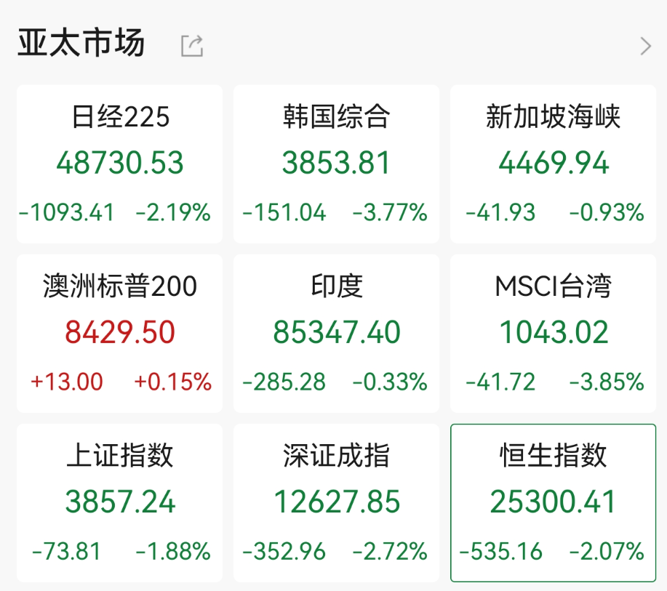 11月21日上午,亚太市场普遍走低,日经225指数跌超2%,韩国综合指数跌超3%,仅澳洲标普200指数微红。