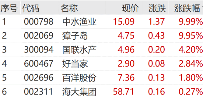 水产板块维持近期景气值,中水渔业6连板,獐子岛涨停。