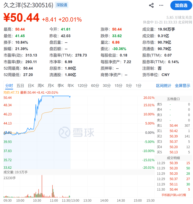 国风新材盘初短暂走高后跳水,一度跌近7%;但在11:00前同样直线拉升,火速封住涨停,成功走出三连板。