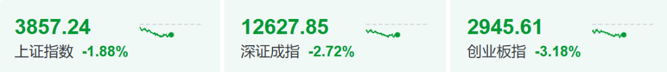 A股市场低开低走,截至午间收盘,上证指数跌1.88%,深证成指跌2.72%,创业板指跌3.18%。