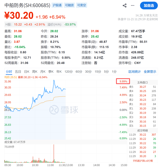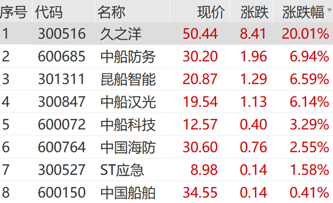 11月21日上午,中船系概念股盘中发力。久之洋直线走高,走出20cm涨停;中船防务盘中触及涨停,昆船智能、中船汉光等跟涨。