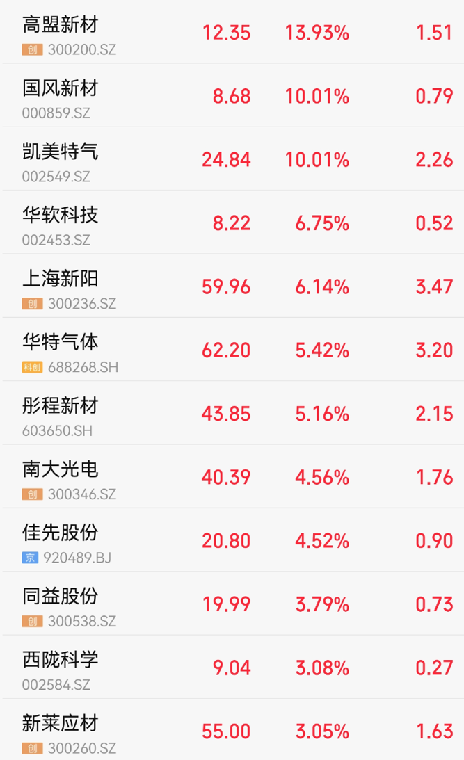 此外,上海新阳、华特气体、彤程新材等多股午前亦有拉升表现。