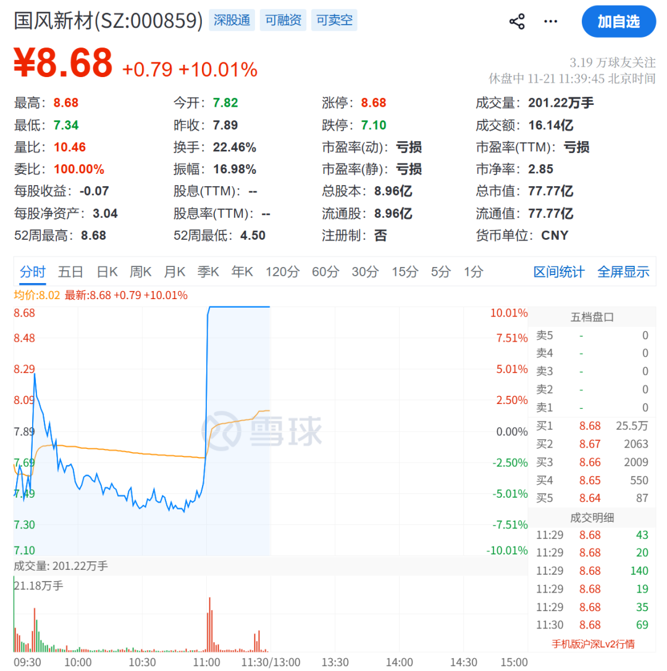 截至午间收盘,国风新材报8.68元/股,当日振幅近17%,买一达25.5万手。