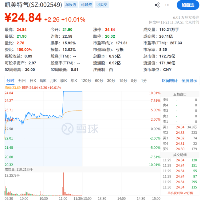 11月21日,光刻胶板块午前拉升。凯美特气在11:00前获大量买盘涌入,一分钟拉出涨停板。