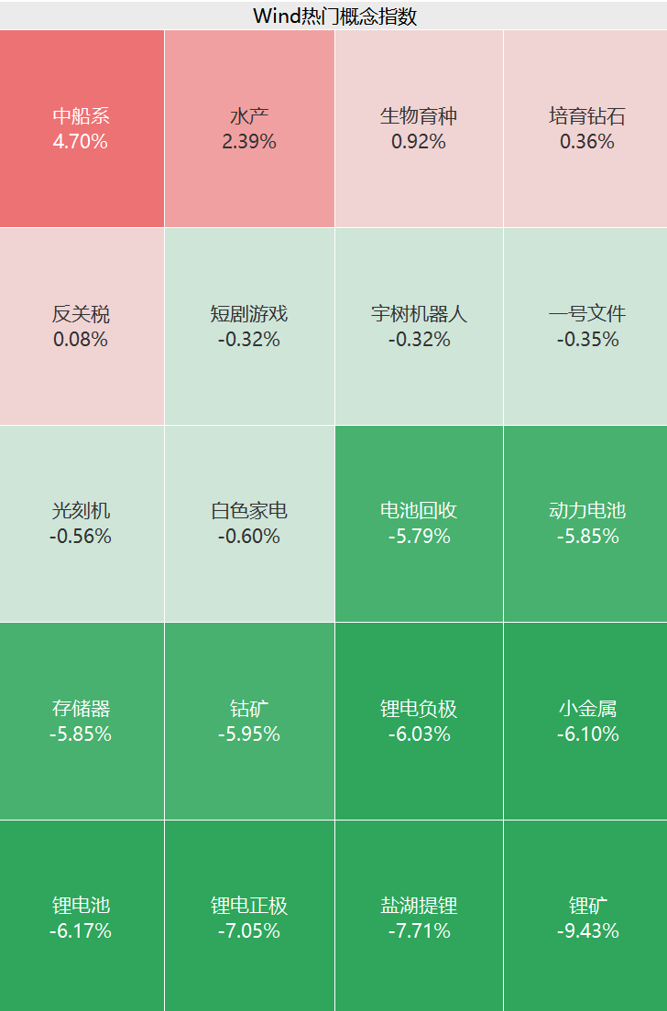 盘面上,上午市场呈现普跌行情,有色金属、电力设备、通信、电子等板块跌幅居前,锂电概念股全线走低;中船系概念股逆市拉升,光刻胶板块走强。