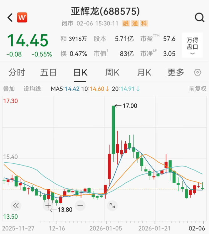 截至2月6日收盘,亚辉龙日内跌0.55%,股价报14.45元/股,最新市值为83亿元,最新股东户数为1.28万户。