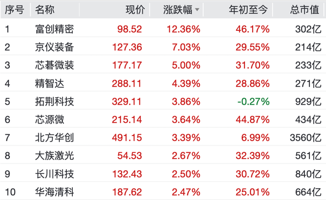 个股方面,富创精密涨超12%,京仪装备涨逾7%,北方华创涨超3%,拓荆科技、芯源微、和林微纳、华海清科、神工股份等跟涨。