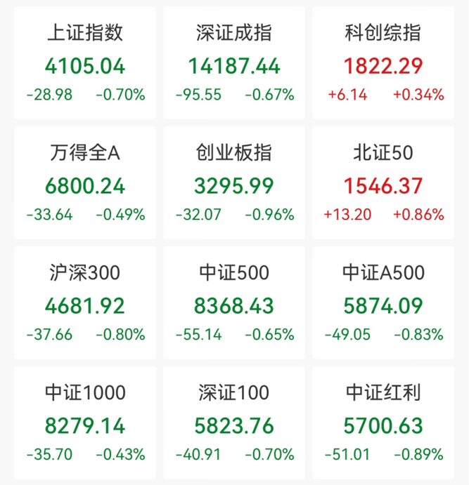 截至午间收盘,沪指报4105.04点,跌0.7%;深证成指跌0.67%,创业板指跌0.96%。科创综指逆市涨0.34%,北证50涨0.86%。