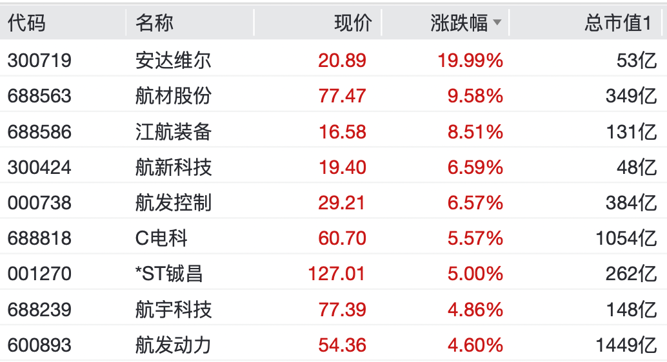 安达维尔录得20cm涨停,航材股份涨超9%,江航装备涨超8%,中航成飞、中航沈飞、航发动力、C电科等纷纷上涨。