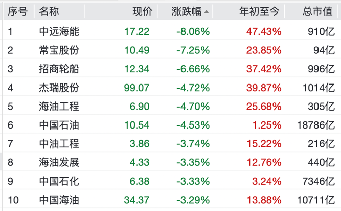中国石油跌4.53%,中国石化跌3.33%,中国海油跌3.29%。杰瑞股份跌超4%,中远海能跌超8%,招商南油、招商轮船、海油工程、中油工程、海油发展等纷纷下跌。