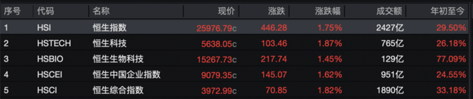 12月12日,港股三大指数集体大涨。其中,恒生指数收涨1.75%,报25976.79点,恒生科技指数涨1.87%,恒生中国企业指数涨1.62%。全日大市成交额为2427亿港元,南向资金净卖出52.87亿港元。