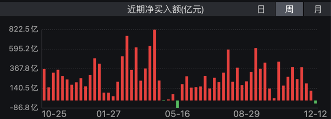 本周,港股通南向总成交额为4777.68亿港元,占恒指总成交额的46.16%。虽然成交热度一定程度上得以维持,但是绝对成交额较年内高点有一定距离。