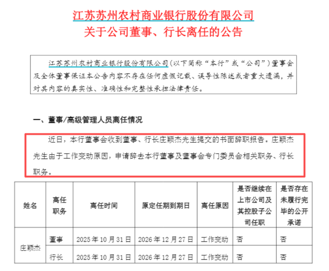 苏农银行表示,近日,该行董事会收到董事、行长庄颖杰先生提交的书面辞职报告。庄颖杰由于工作变动原因,申请辞去该行董事及董事会专门委员会相关职务、行长职务。庄颖杰的离任时间为10月31日,离任后不再继续在苏农银行及该行控股子公司任职。