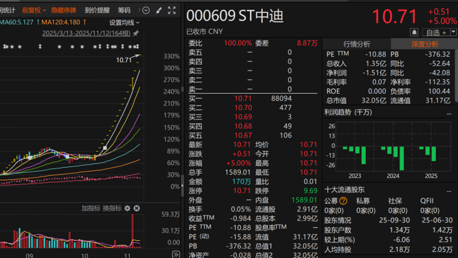自10月17日起,ST中迪已连续录得19个涨停板,最新市值为32.05亿元。