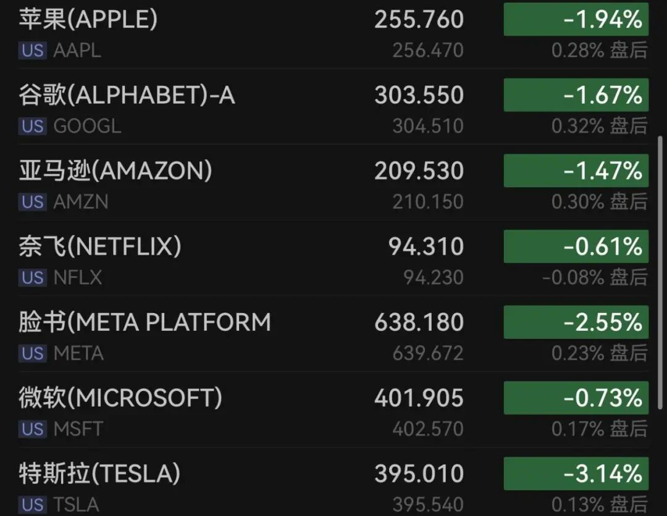 大型科技股集体下跌,特斯拉跌超3%,脸书跌逾2%,苹果跌近2%,谷歌、英伟达、亚马逊跌超1%,微软跌0.73%。