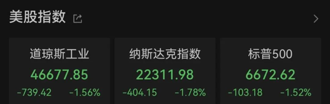 美国三大股指全线收跌,道指跌1.56%,报46677.85点,标普500指数跌1.52%,报6672.62点,纳指跌1.78%,报22311.98点。