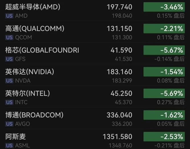 芯片股普遍下跌,费城半导体指数跌3.43%,英特尔跌超5%,台积电跌5%,微芯科技跌超4%,德州仪器跌逾4%,恩智浦半导体跌超4%,超微半导体跌逾3%,美光科技跌超3%。