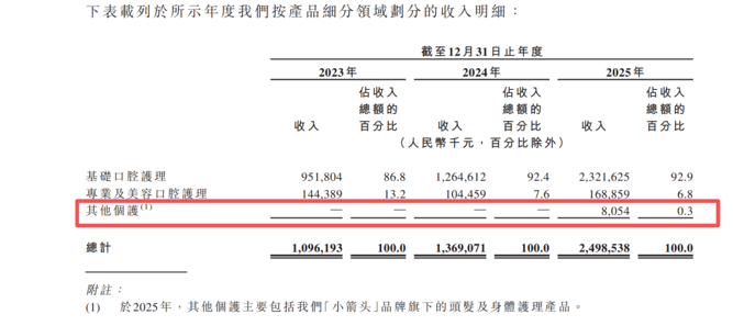 从产品矩阵看,小阔科技极度依赖“基础口腔护理”(牙膏、牙刷)这一单一业务,2025年该业务占总营收的92.9%。虽然其试图通过“小箭头”(身体护理)来寻找第二增长曲线,但目前新业务占比仅为0.3%,尚不足以担起大梁。