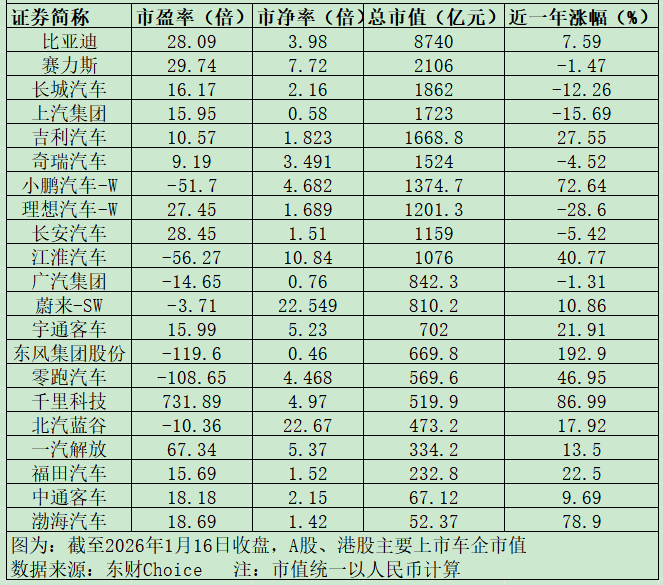 在A股、港股上市的大部分车企,市值均在2000亿元以下。截至2026年1月16日收盘,比亚迪、赛力斯、长城汽车的市值排名上市车企前三,分别达8493亿元、2106亿元、1862亿元。