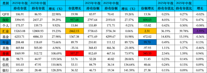 银行、信托、私募等机构也实现翻倍级增长:银行持有市值较2025年年中大增128.2%,信托增长110.86%,私募增长119.54%;持有份额方面,银行大增141.59%,信托增长134.64%,私募增长28.06%。
