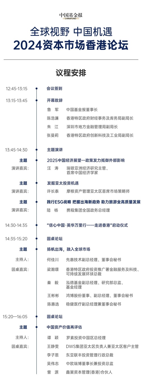 11月21日,中国基金报将以“全球视野 中国机遇”为主题,召开2024资本市场香港论坛。本次论坛将汇集深港两地监管机构、顶尖全球金融机构经济学家、策略师、相关业务负责人和中国企业出海代表,一起探讨新的环境下,中国企业扬帆出海捕捉全球机遇的新进展,畅议变革时代中国资产价值重估的方法和机遇。