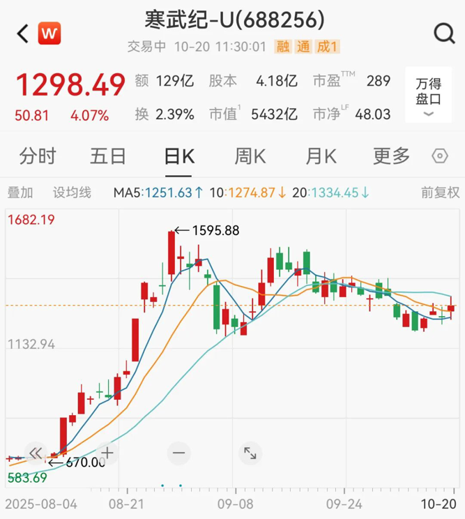 寒武纪涨超4%,现报1298.49元/股。