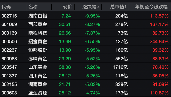 个股方面,湖南白银跌停,西部黄金跌逾8%,晓程科技跌逾7%,招金黄金、恒邦股份、赤峰黄金、山东黄金、四川黄金、湖南黄金等均跌超5%。
