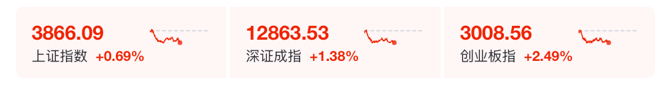 截至午间收盘,沪指报3866.09点,涨0.69%;深证成指涨1.38%;创业板指涨2.49%。