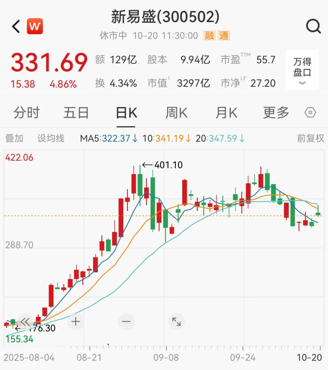 新易盛涨4.86%,现报331.69元/股,最新市值为3297亿元。