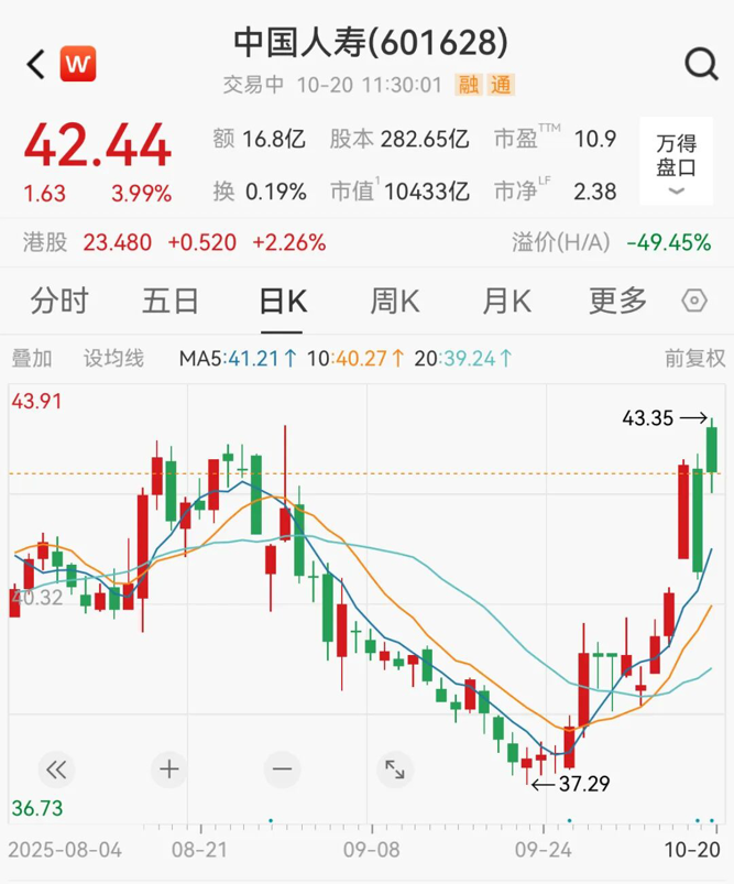 保险股全线上涨,中国人寿涨近4%,现报42.44元/股,最新市值为10432亿元。