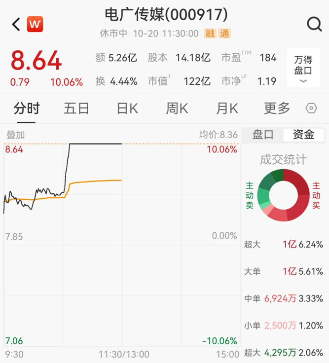 今日上午,电广传媒高开高走,10点30分后直线拉升,迅速封死涨停板。截至发稿,股价报8.64元/股。