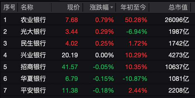 银行相关个股涨跌互现,工商银行、建设银行、中国银行、交通银行、邮储银行、中信银行股价微跌,兴业银行、光大银行等上涨。