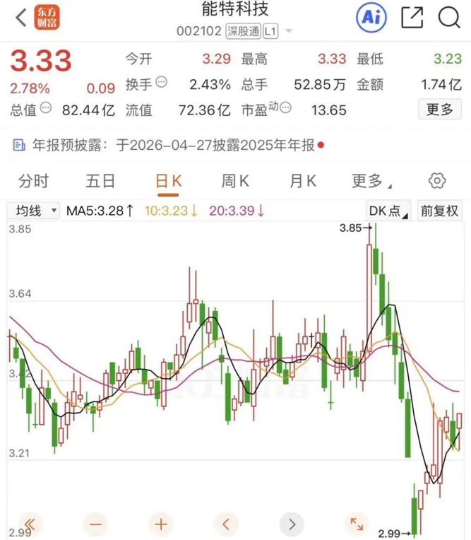 截至4月1日收盘,能特科技报3.33元/股,最新市值为82.44亿元。