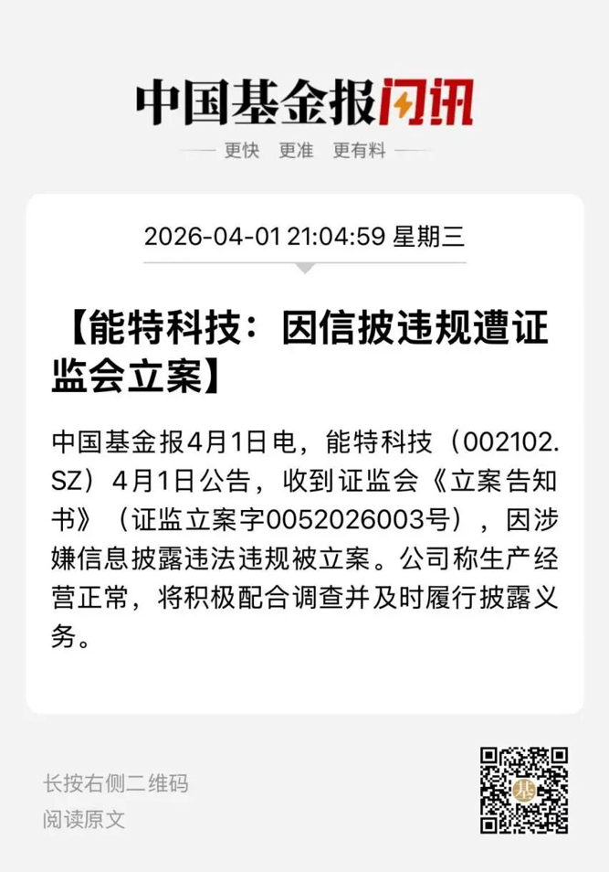 4月1日,能特科技发布公告称,公司收到中国证监会下发的《立案告知书》,因涉嫌信息披露违法违规,根据法律法规,中国证监会决定对公司立案。