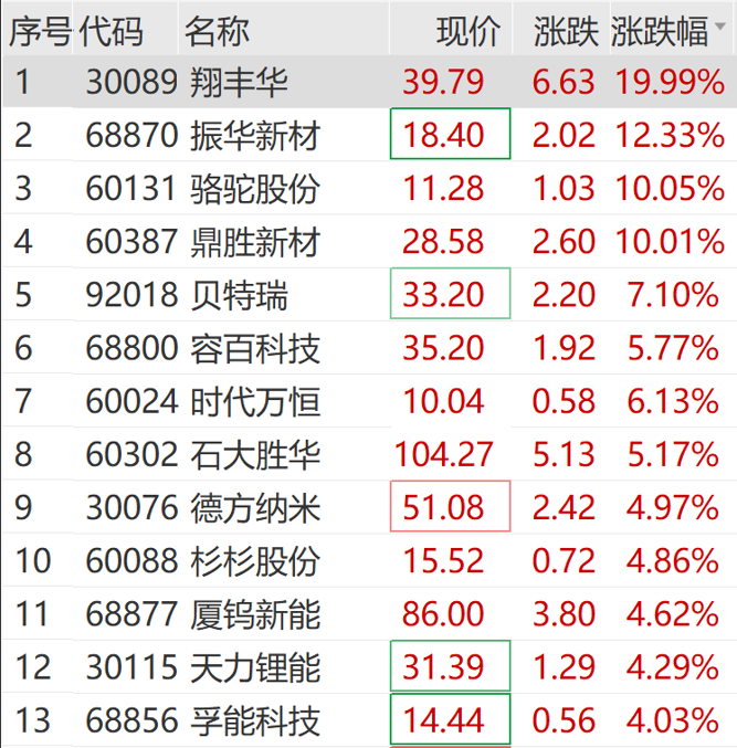 振华新材涨超10%,骆驼股份、鼎胜新材涨停,贝特瑞、时代万恒、容百科技等跟涨。