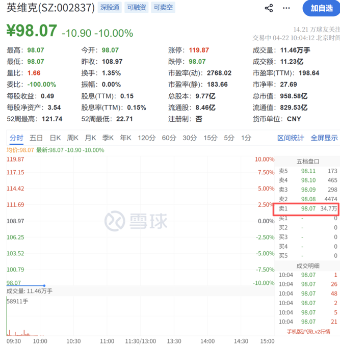 4月22日,英维克开盘报98.07元/股,跌幅为10%,连续两日跌停;总市值为958.58亿元。截至发稿,英维克仍保持跌停状态,卖一超34万手。
