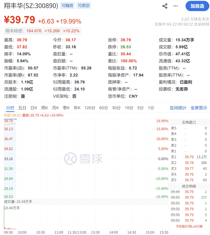 个股方面,翔丰华开盘1分钟内走出20cm涨停,报39.79元/股。