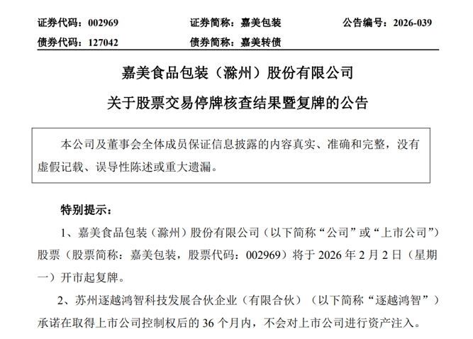 【导读】锋龙股份、嘉美包装将于2月2日起复牌