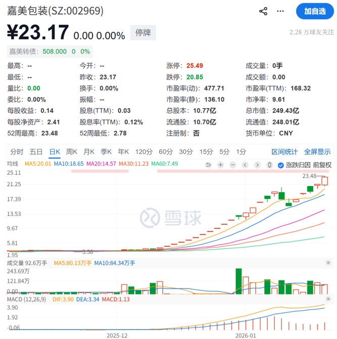 此次停牌前,嘉美包装股价为23.17元/股,总市值为249.43亿元。
