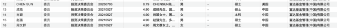 Wind信息显示,目前富达基金投决会有五人,分别是总经理孙晨、固定收益副总监成皓、固定收益研究副总监肖颖、多元资产部负责人赵强、股票部副总监周文群。