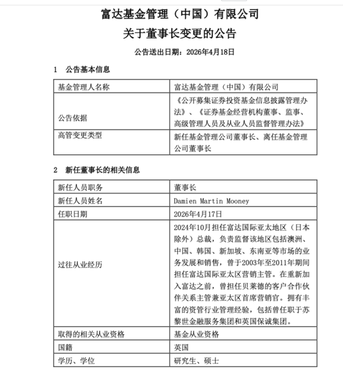 4月18日,富达基金公告更换董事长:李少杰离任,富达亚太区(日本除外)总裁莫达文(Damien Mooney)被任命为富达基金管理(中国)有限公司董事长,任期自4月17日开始。
