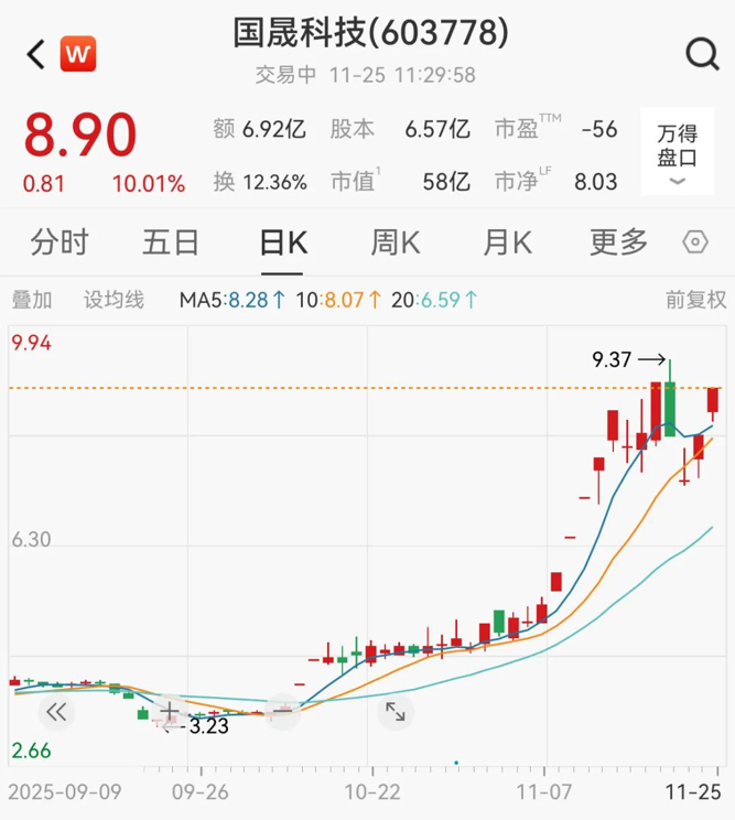 今天上午,光伏设备板块拉涨。国晟科技10cm涨停,录得12日8板。截至午盘,该股报8.9元/股,最新市值为58亿元。