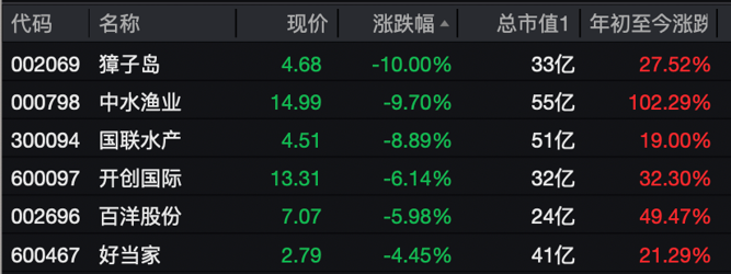个股方面,中水渔业跳水跌停,此前曾斩获7连板。獐子岛10cm跌停,国联水产跌近9%。