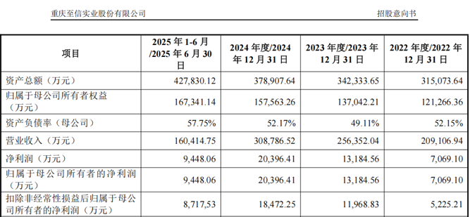 2022年至2024年及2025年上半年,至信股份的营业收入分别为20.91亿元、25.64亿元、30.88亿元及16.04亿元,归母净利润分别为7069.10万元、1.32亿元、2.04亿元及9448.06万元。