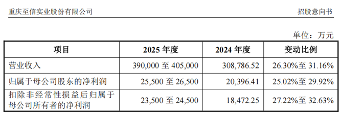 招股意向书显示,基于目前的经营状况和市场环境,至信股份预计其2025年的营业收入为39.00亿元至40.50亿元,同比增长26.30%至31.16%;归母净利润为2.55亿元至2.65亿元,同比增长25.02%至29.92%。