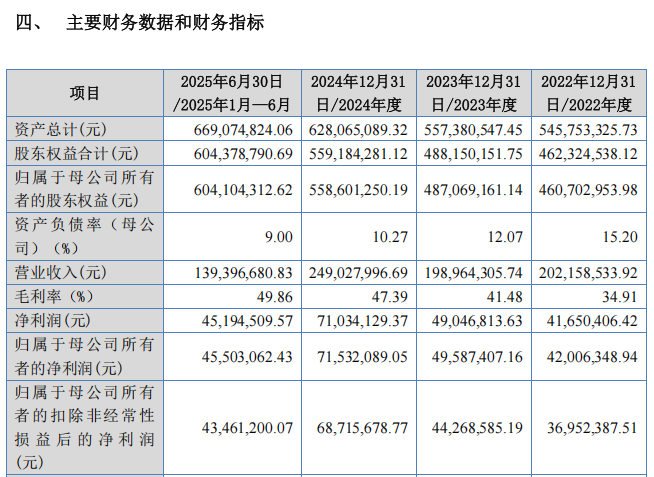 2022年至2024年及2025年上半年,科马材料的营业收入分别为2.02亿元、1.99亿元、2.49亿元及1.39亿元,归母净利润分别为4200.63万元、4958.74万元、7153.21万元及4550.31万元。