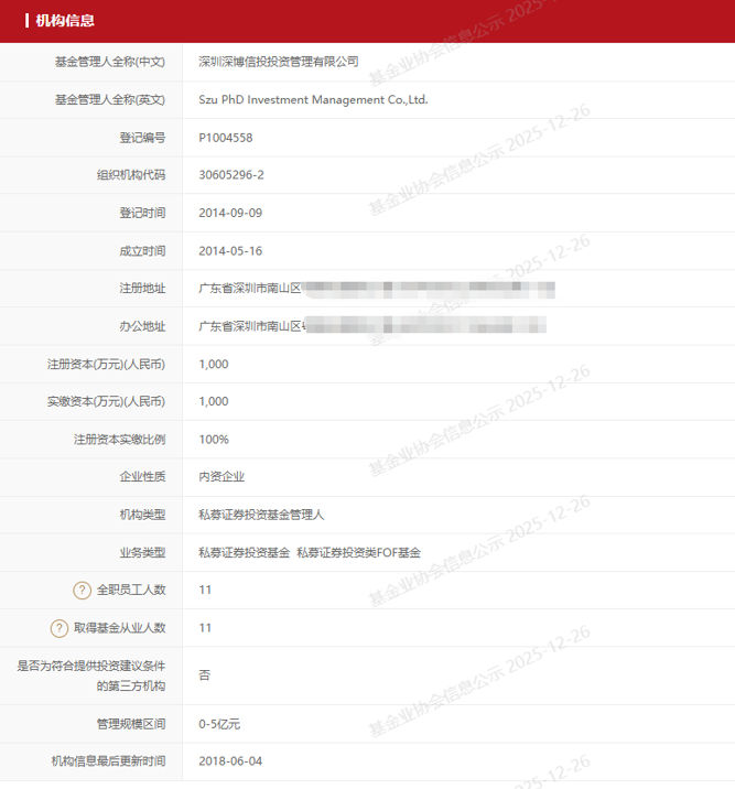 公开资料显示,深博信投成立于2014年,注册资本为1000万元,全职员工11人,管理规模区间为0~5亿元。