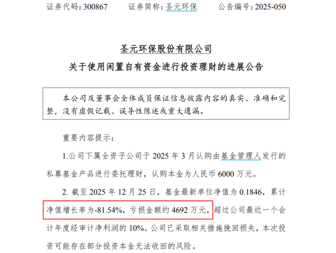 【导读】圣元环保子公司投资私募基金亏损超4600万元,已向公安机关报警